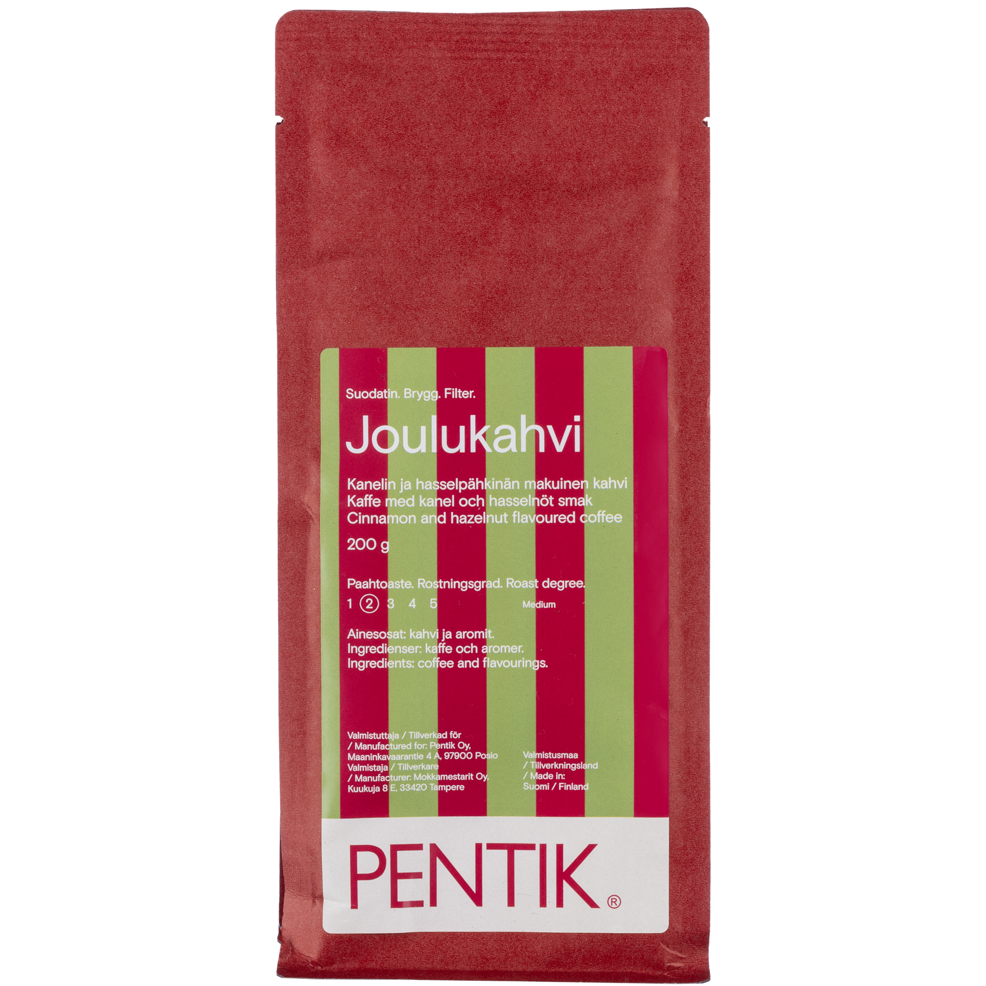 Julkaffet är gjort på Arabica-kaffe kryddat med kanel och hasselnöt. Pentiks kaffe tillverkas i Finland, på Mokkamestari kafferosteri i Tammerfors, Finland. Detta kaffe är perfekt för de där ljuva julstunderna och är också en fin present. Om du vill njuta av smakerna när de är starkast, brygg det som det är, precis som vanligt filterkaffe. Du kan också blanda julkaffet med ditt favoritfilterkaffe.