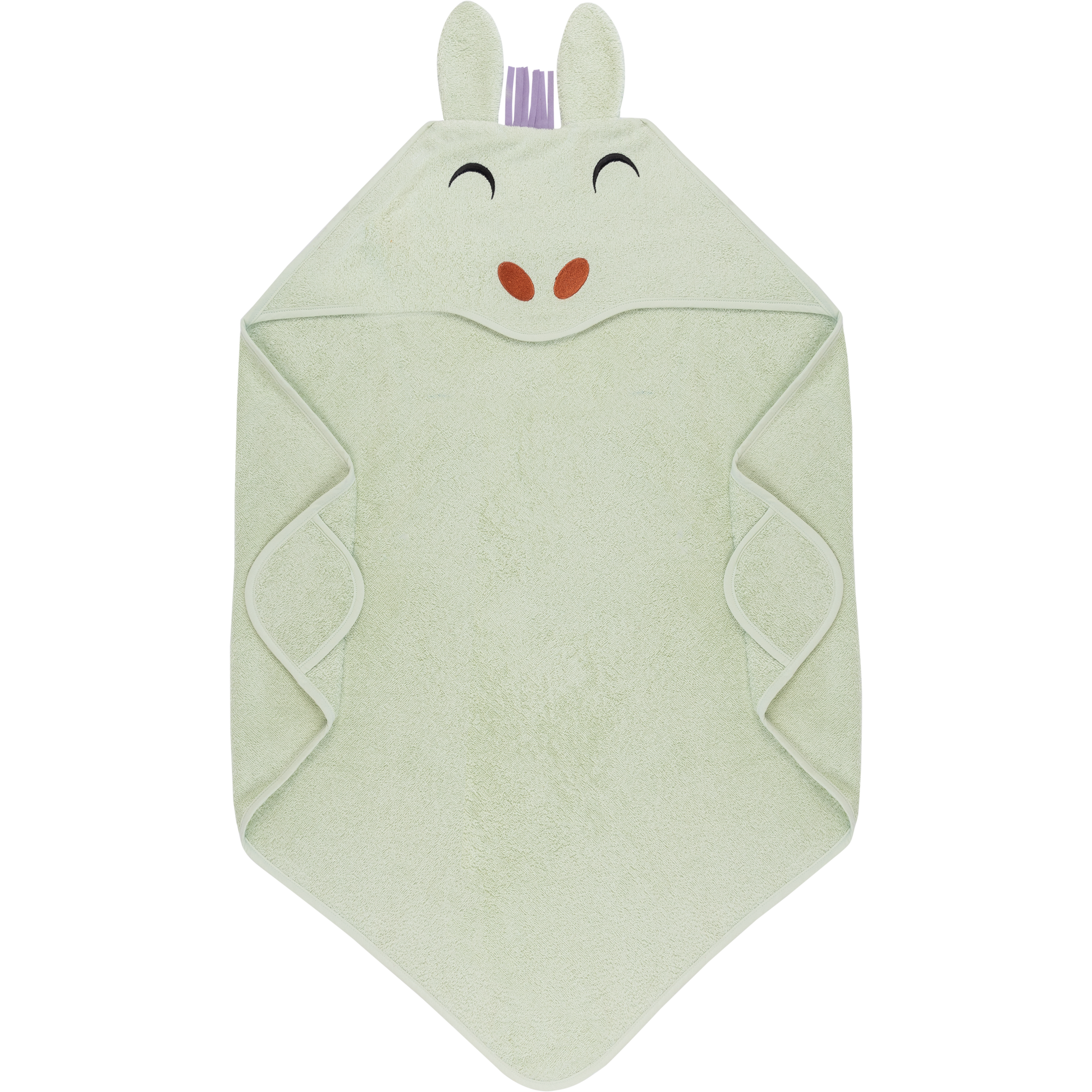Storleken på barnhandduken med huva är 73x73 cm. Badhandduken är tillverkad av 100 % bomull.