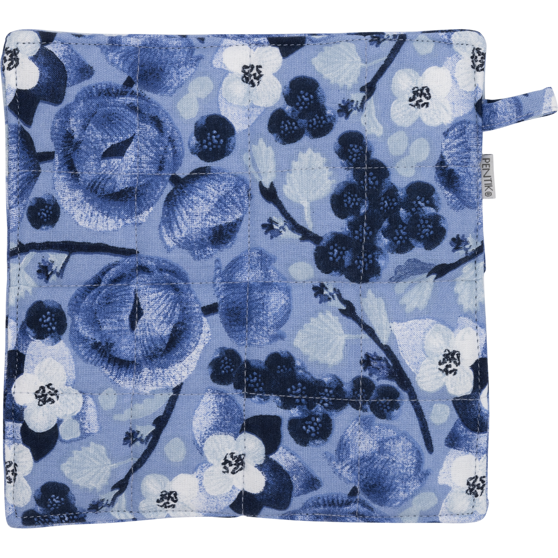 Den blåvita Lapinkukka-grytlappen är 21x21 cm stor. Maskintvättbar i 60 grader. Se upp för ugnselement och öppen eld. Produkten är avsedd för hantering av varm disk.