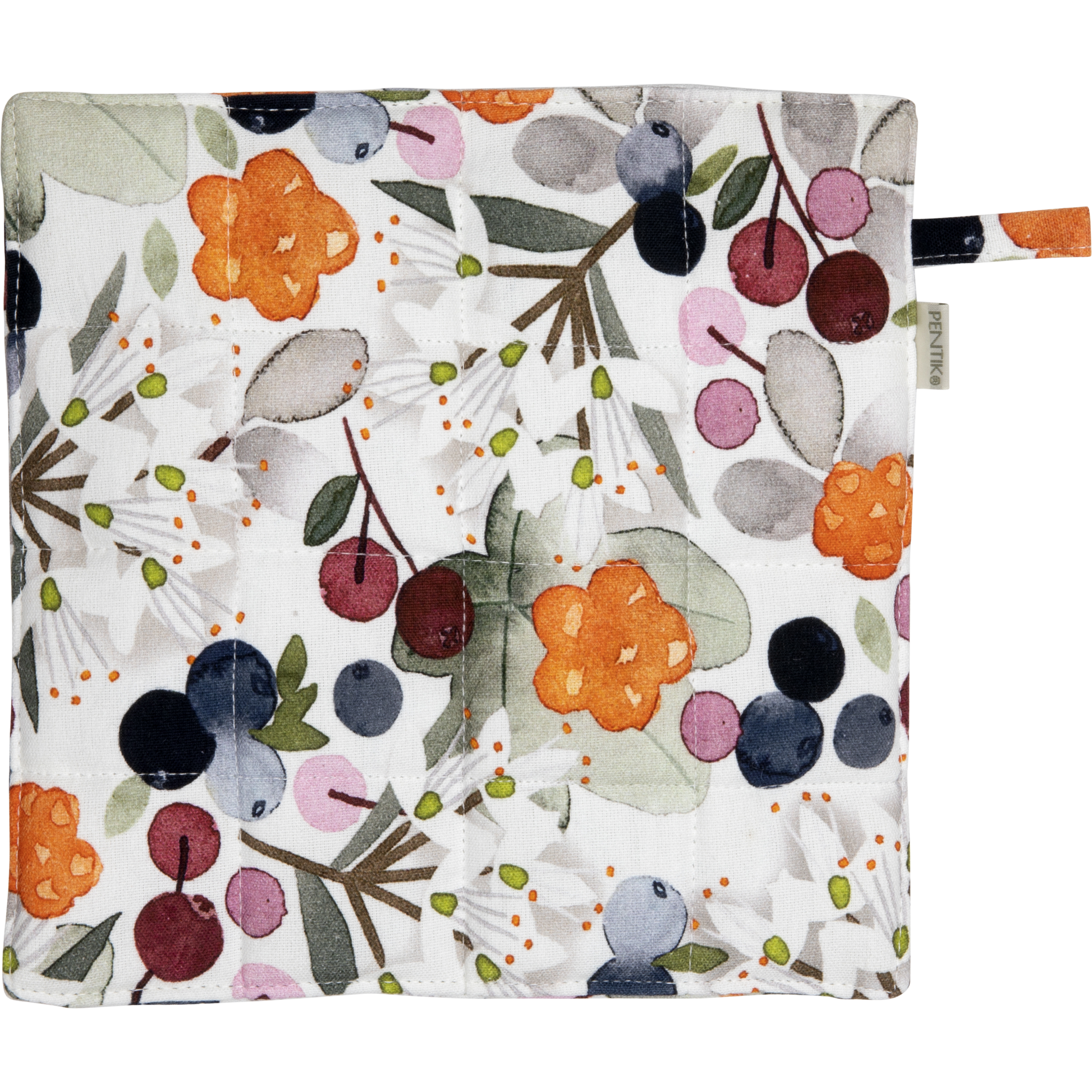 Metsämarja grytlapp är 21x21 cm stor och tillverkad av 100 % bomull (fyllningen är polyester). Tvättas i 60 grader.