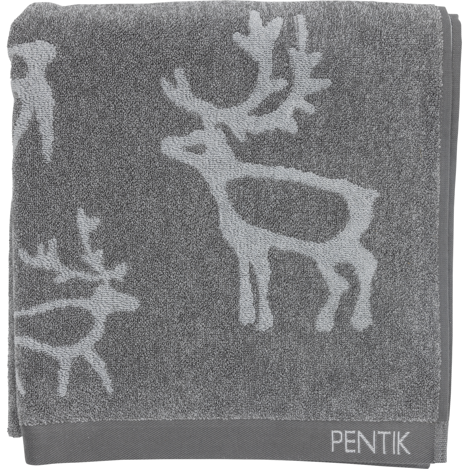 Den grå Saaga-badhandduken är tillverkad av 100 % bomullsfrotté, är 70x150 cm stor och kan maskintvättas i 60 grader.