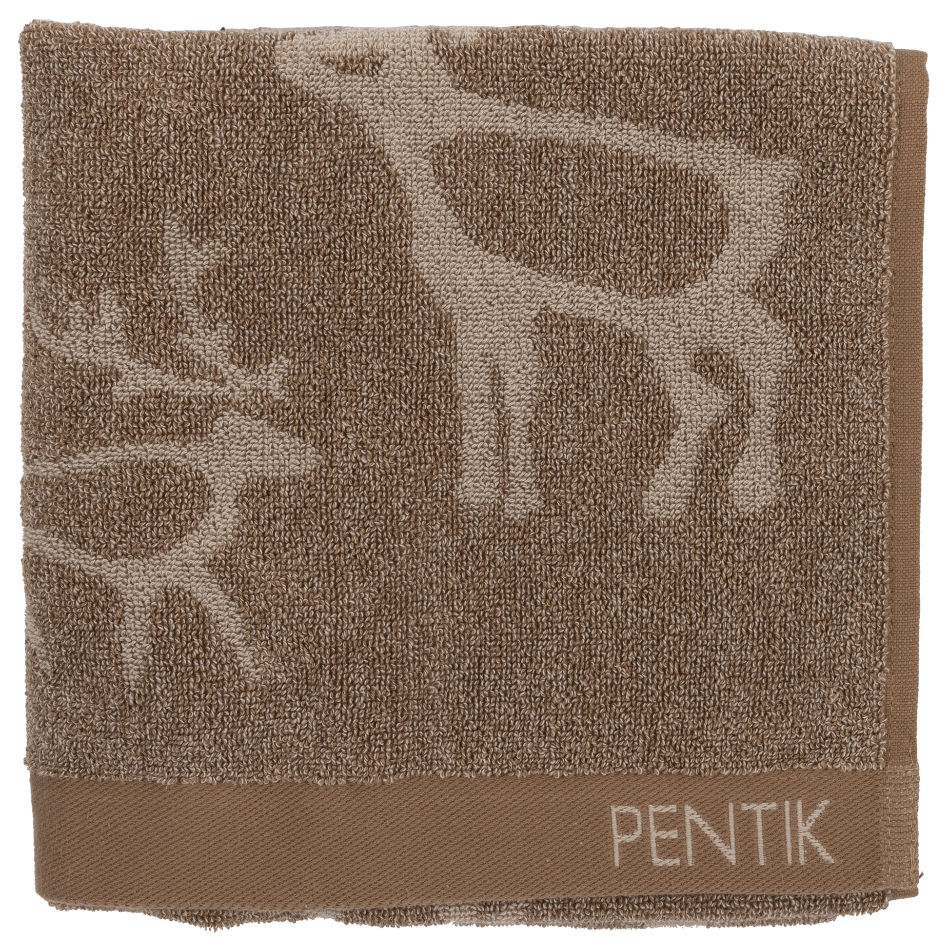 Den bruna Saaga-handduken är tillverkad av 100 % bomullsfrotté, är 50x70 cm stor och kan maskintvättas i 60 grader.